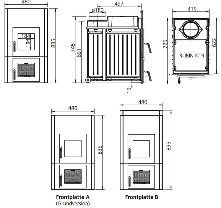 Der Kachelofeneinsatz Rubin K19 ist als Grundversion oder mit Anbauleiste für eine erweiterte Frontplattengröße bei Kaminprofi24 erhältlich.