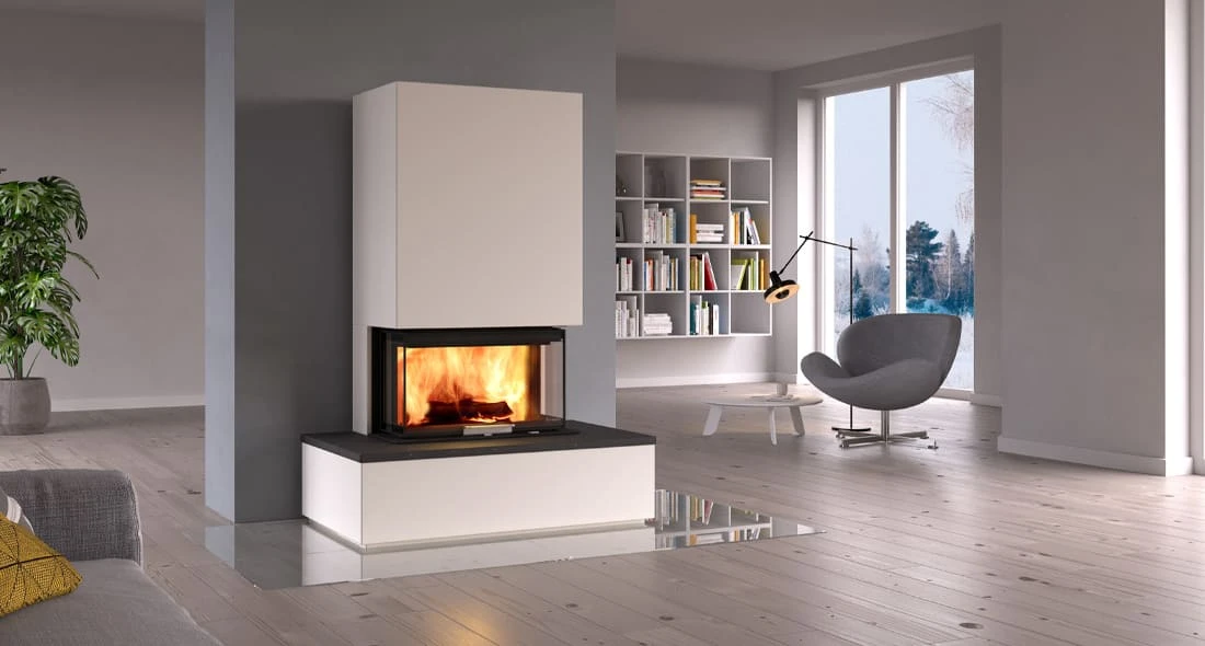 Der Anschluss des in diesem 3-Seiten-Kamin verbauten Kamineinsatz Nordpeis Q-34UL kann ganz flexibel oben oder hinten vorgenommen werden.