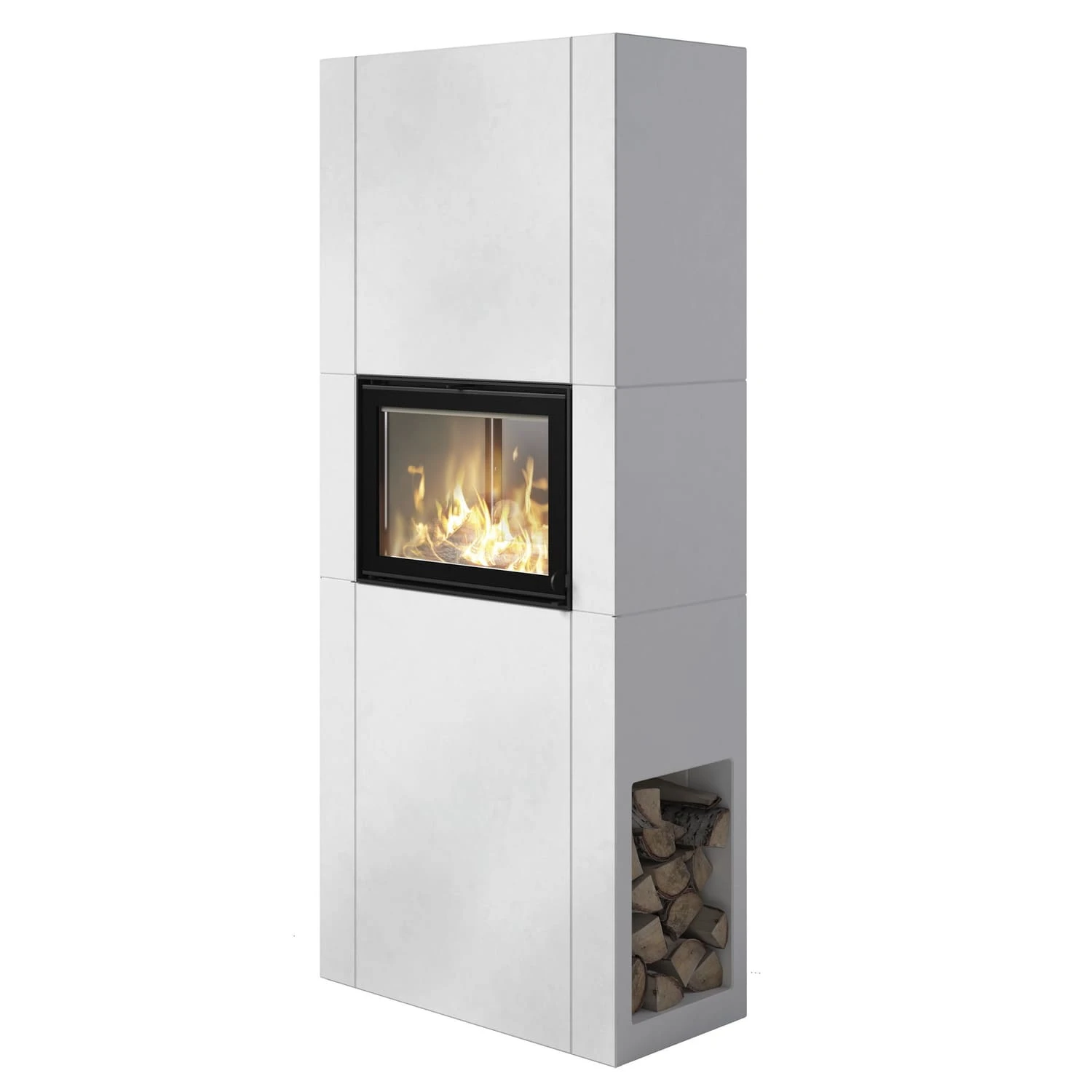 Die Kaminbausätze des norwegischen Herstellers Nordpeis überzeugen durch moderne Designs im angesagten Skandinavischen Stil, den Einsatz hochwertiger Materialien und große Produktvielfalt sowie mit kinderleichtem Aufbau. Der Korpus des Kamines wird gefertigt aus Spezialbeton, dem sogenannten Shape Stone Light, dessen hohe Haltbarkeit und Festigkeit durch eine, in den belasteten Bereichen sogar verstärkte, Faserarmierung erlangt wird. Das Material hat eine leichte Speicherwirkung und sorgt so auch nach dem Abbrand für eine angenehme Strahlungswärme, dank welcher ein nachhaltig wohlig-warmes Raumklima geschaffen wird. Bei dem Modell Osaka T handelt es sich um einen Kaminbausatz für einen Durchsichtkamin, was ihn zu einem aufsehenerregenden Raumteiler der ganz besonderen Art macht. Die Einsicht in den Feuerraum und damit auf das herrlich prasselnde Feuer in seinem Inneren ist von zwei gegenüberliegenden Seiten möglich. Dank integrierter Scheibenspülung und Doppelverglasung bleiben die Scheiben wunderbar sauber. Praktisch ist das Holzfach auf der Seite des Kaminbausatzes, dank dem Sie eine kleine Menge Brennholz stets griffbereit und gleichzeitig stilsicher aufbewahrt wissen. Bei der Gestaltung des Kamines lag der Fokus auf einer klaren Formensprache mit markanter Linienführung, der graue Spezialbeton kann darüber hinaus für eine individuelle Gestaltung mit einer Ofenfarbe in Ihrem Wunschfarbton angestrichen werden. Der Anschluss des in diesem Tunnelkamin verbauten Kamineinsatz Nordpeis N-20T kann ganz flexibel oben oder seitlich vorgenommen werden. Der Kaminbausatz Osaka T ist als Basismodell ohne oder mit Powerstone Wärmespeicher für eine verlängerte Wärmedauer (nur bei oberem Rauchrohranschluss möglich!) bei Kaminprofi24 erhältlich.