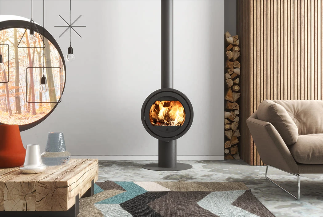Die Odin Kaminöfen des etablierten niederländischen Herstellers Dik Geurts sind wie geschaffen für Kunden mit besonderem Anspruch an innovatives Design und herausragend ästhetische Optik. In Kombination mit modernster Feuerungstechnik und höchster Qualität bei Materialien und Verarbeitung füllt Odin Tunnel den Raum mit Wärme und Behaglichkeit, während er die in seinem Inneren tanzenden Flammen dank seiner großzügigen, kreisrunden Verglasung selbstbewusst in Szene setzt. Die beidseitige Verglasung des Tunnelkamines erlaubt dem Betrachter dabei eine spektakuläre Sicht sowohl von der Vorderseite als auch von der Rückseite des Gerätes aus. Dadurch entsteht nicht nur ein spektakulärer Blick in das Innere des Odin Tunnel, sondern eine direkte Durchsicht, was den Ofen zu einem idealen Raumteiler mit luftiger Anmutung macht. Der in elegantem Anthrazitschwarz lackierte Kaminofen ist darüber hinaus in zahlreichen verschiedenen, attraktiven Ausführungen erhältlich. Ob als deckenmontiertes Gerät, als Konzept-Feuermöbel mit fließendem Übergang in eine eigens dafür entwickelte und höchst praktische Holzablage in 2 unterschiedlichen Breiten oder aber platziert auf einem stilvollen Sockel – der Odin Tunnel lässt sich mühelos in jedes individuelle Interieur integrieren und verbreitet eindrucksvoll seinen außergewöhnlichen Charme. Die Ausführung mit Holzablage ist auf Anfrage auch als Sonderanfertigung mit Plateau in einer Breite gemäß des persönlichen Kundenwunsches erhältlich. Sollte bei Auswahl der deckenmontierten Ausführung eine andere als die im Standard zur Verfügung stehende Länge von 190 cm gewünscht werden, ist dies ebenfalls auf Anfrage als Sonderanfertigung gern möglich.