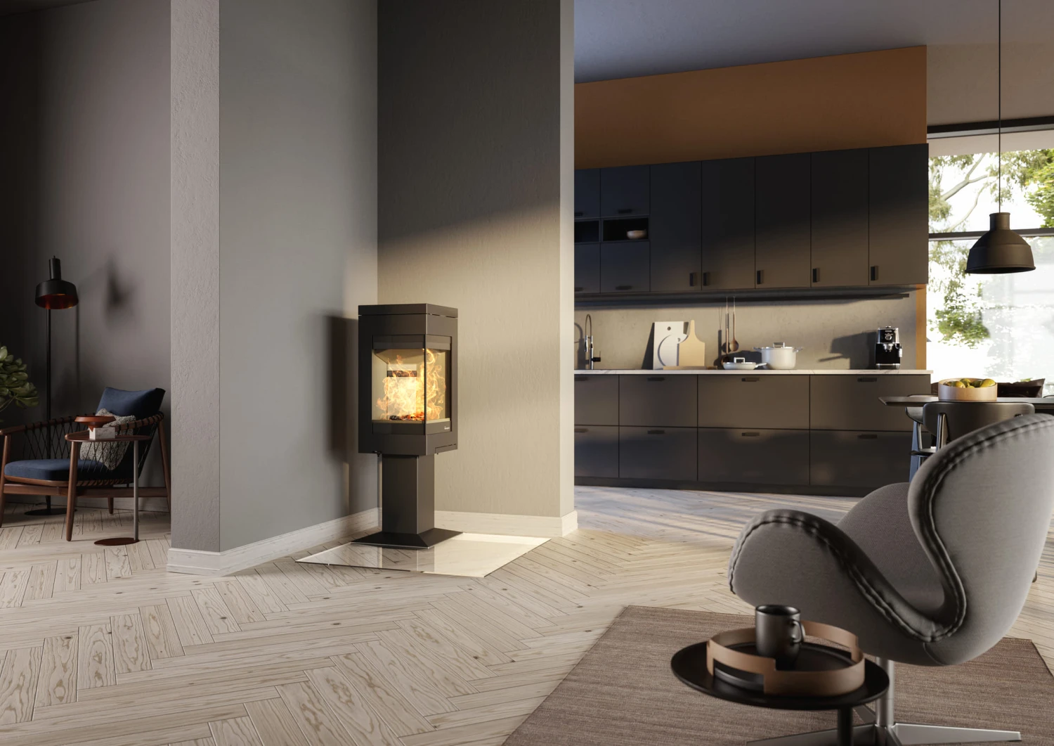 Die Kaminöfen des norwegischen Herstellers Nordpeis überzeugen durch moderne Designs im angesagten Skandinavischen Stil und den Einsatz hochwertiger Materialien. Besonderes optisches Highlight des ca. 1,23 m hohen Kaminofens Quadro 1 Basic ist die großzügige Panorama-Eckverglasung, die dem Betrachter einen spektakulären Blick auf das herrlich prasselnde Kaminfeuer im Inneren des Kaminofens erlaubt. Der Quadro 1 Basic ist für die Platzierung innerhalb vieler Raumkonstellationen eine ausgezeichnete Wahl, denn durch seinen besonderen Grundriss und seine klappbare Eckglastür lässt sich dieser Schwedenofen perfekt in eine Raumecke positionieren, aber auch direkt vor eine Wand stellen, so dass Sie aus allen Blickwinkeln das lebendige Feuerspiel in seinem Inneren genießen können. Der Korpus des Eckkamines wird gefertigt aus hochwertigem, in elegantem Schwarz lackiertem Stahl, eine Topplatte aus dem gleichen Material rundet die Optik des Kaminofens perfekt ab. Der schlanke Sockel ergänzt gekonnt das stilvolle Design und unterstreicht das charakteristische Erscheinungsbild des Quadro 1 Basic.