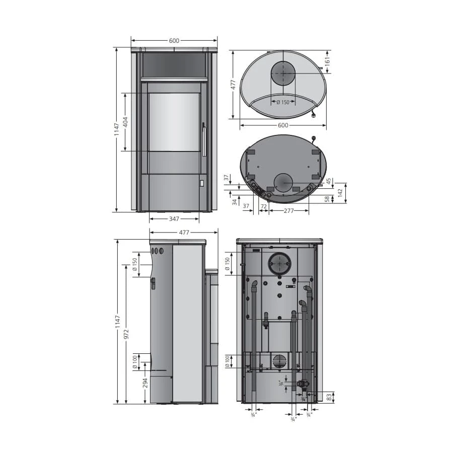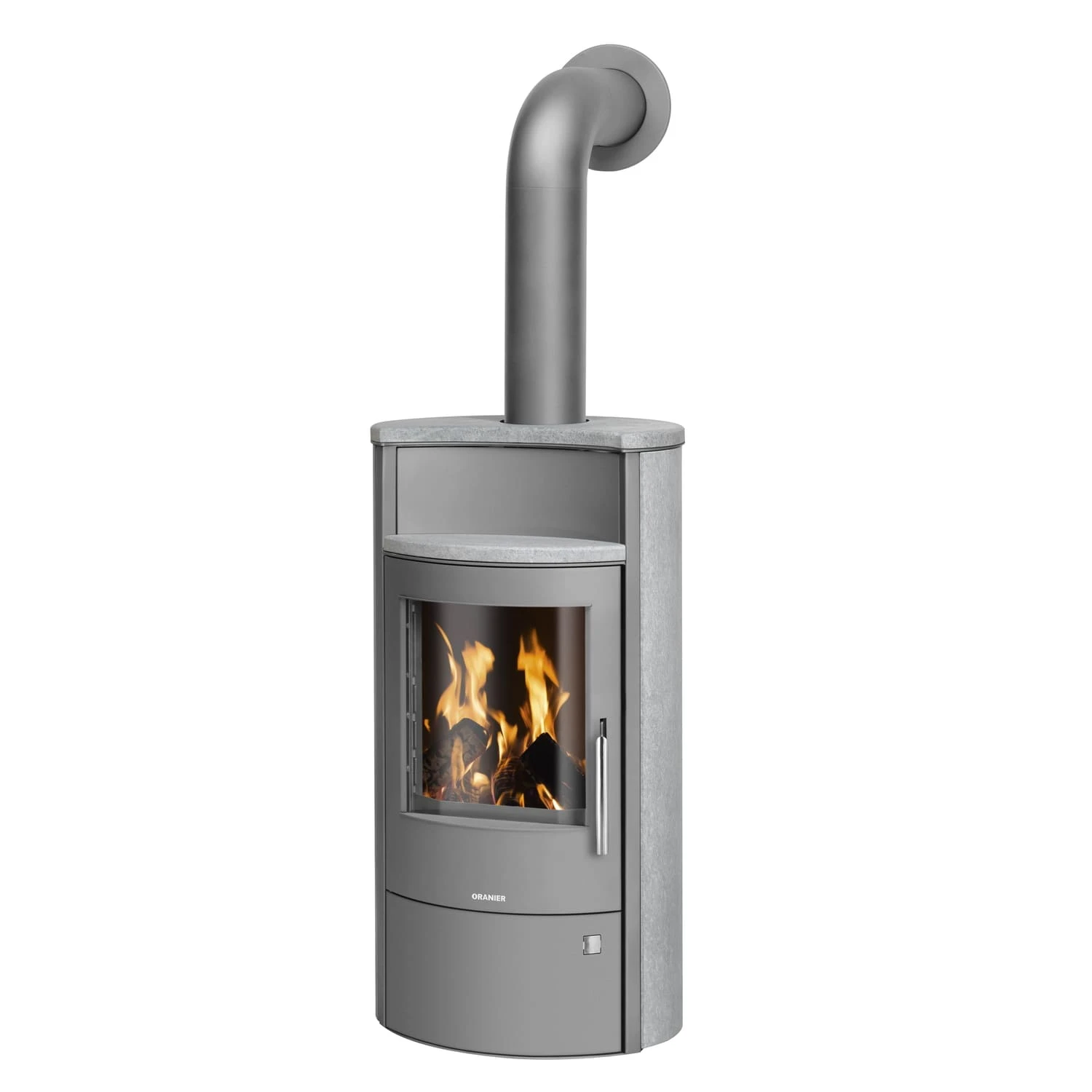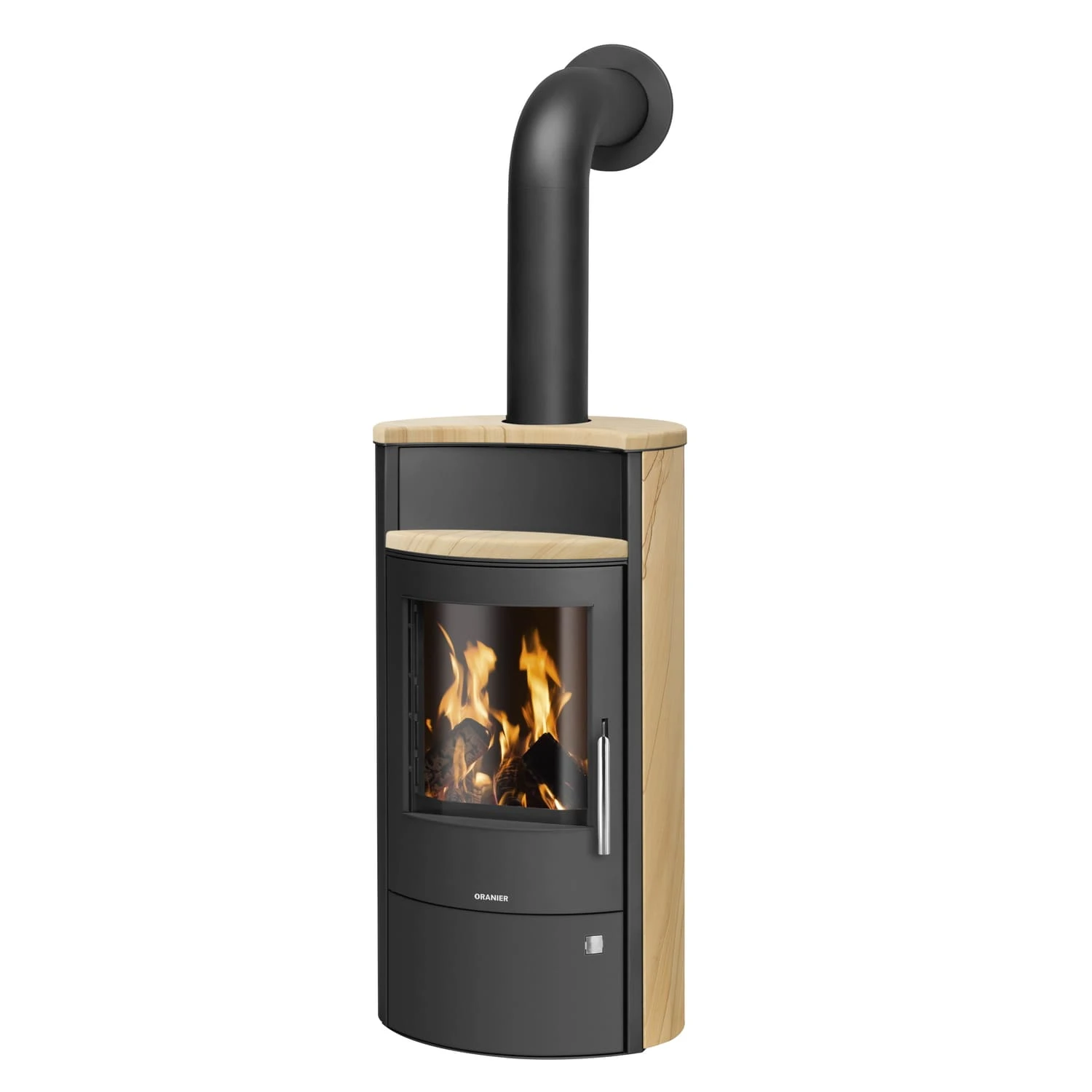 Die Kaminöfen der Serie Pori des traditionsreichen deutschen Familienunternehmens ORANIER Pori sind mit ihrem harmonischen Design und der eleganten ovalen Grundform besonders vielseitig einsetzbar, da sie sich durch die schlichte, schnörkellöse Form des in elegantem Schwarz lackierten Korpus und die unterschiedlichen zur Verfügung stehenden Konfigurationsmöglichkeiten der Seitenverkleidung und der Top-Platte besonders gut an den Charakter und das Interieur eines jeden Raumes anpassen lassen. Bei der Auswahl der Verkleidung in den zur Verfügung stehenden Naturstein-Varianten punktet der Pori Aqua außerdem mit einer dezenten Speicherleistung, denn diese Materialien speichern die Wärme des Feuers und geben sie langsam und gleichmäßig wieder an die Umgebung ab. So wird auch über einen längeren Zeitraum ein angenehm-wohliges Raumklima geschaffen. Der Pori Aqua ist mit einer integrierten Wassertasche ausgestattet. Durch den Anschluss dieser an das zentrale Heizsystem lassen sich so selbst weit entfernte Räume mit Ihrem Kaminofen beheizen. Das Wärmeabgabeverhältnis des Schwedenofens beträgt 50 / 50, d.h. dass rund 50 % der durch den Kaminofen produzierten Wärme dem Wasserkreislauf und damit dem gesamten zu Objekt (Haus) zur Verfügung stehen. Der Rest wird als Strahlungswärme in den Aufstellraum abgegeben und erzeugt dort die typische wohlige Wärme, die nur ein Kaminofen erzeugen kann. Durch dieses Verhältnis wird das Risiko des Überheizens des Aufstellraumes deutlich reduziert und gleichzeitig die Energie optimal genutzt. Praktisch ist auch das integrierte, diskret hinter einer Tür verborgene, Holzfach, dank welchem Ihr Holzvorrat stets stilvoll und griffbereit aufbewahrt ist. Auch ein offenes Warmhaltefach über dem Feuerraum ist vorhanden, um die erzeugte Wärme noch vielseitiger nutzen zu können. Ein weiteres Highlight ist seine Vielseitigkeit hinsichtlich der Brennstoffe, denn der Pori Aqua ist zugelassen für Scheitholz sowie für Holz- und Braunkohlebriketts.