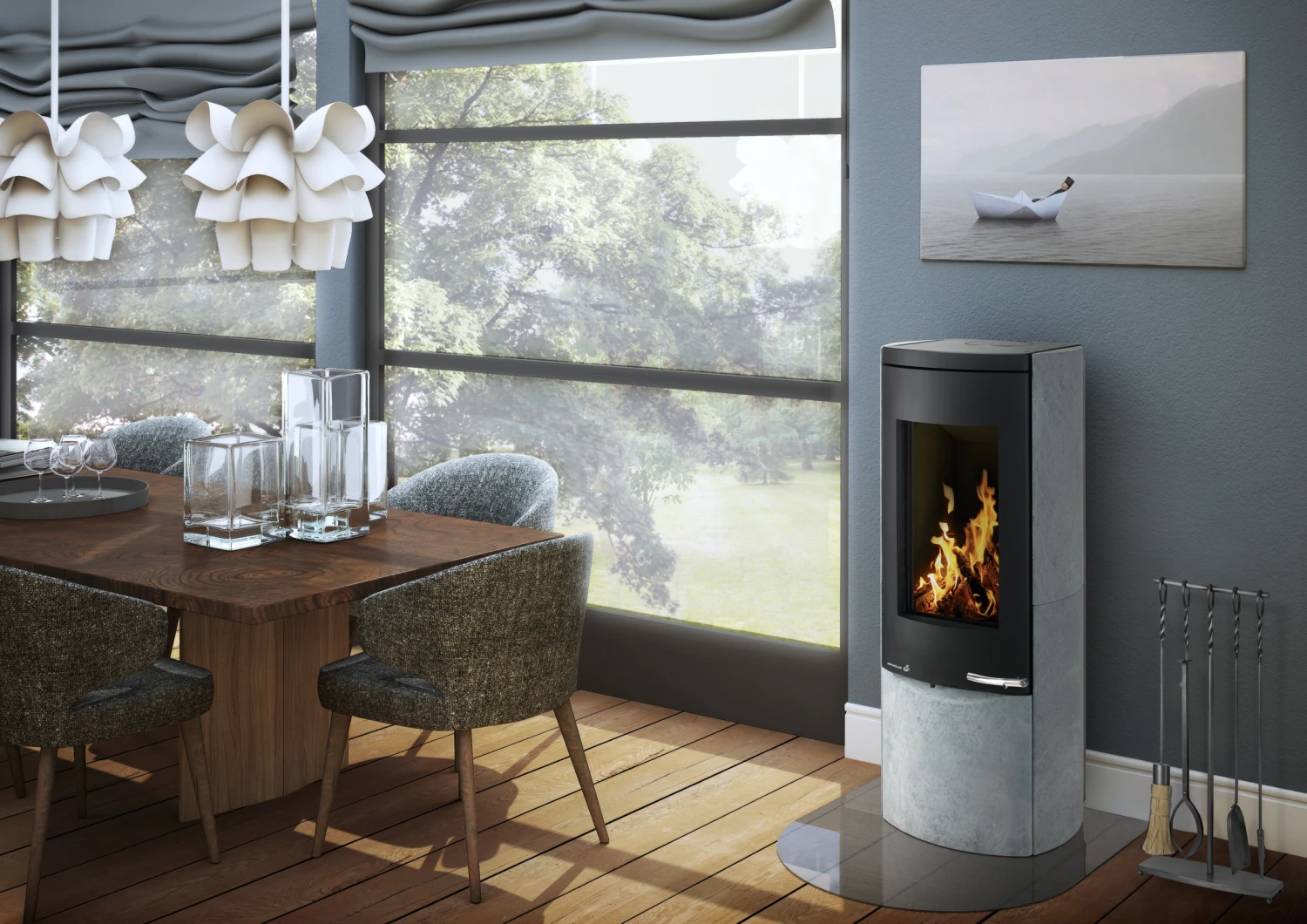 Die großzügige Natursteinverkleidung der Seiten und des Bereiches unter dem Feuerraum sorgt für einen dezenten Speichereffekt, denn sie speichert die Wärme des Feuers und gibt diese langsam und gleichmäßig wieder an die Umgebung ab. So wird auch über einen längeren Zeitraum ein angenehm-wohliges Raumklima geschaffen.