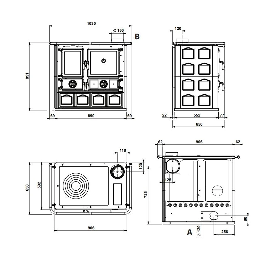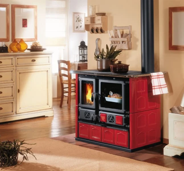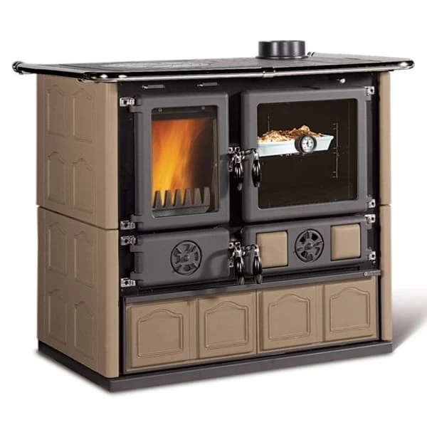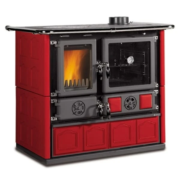 Der Küchenofen Rosa Maiolica 5.0 des italienischen Traditionsunternehmens LA NORDICA bietet mit seiner nostalgisch anmutenden, aber doch zeitgemäßen Optik höchstes Kochvergnügen und gleichzeitig das typische, herrliche, wohlige Wärmeerlebnis, welches ein Holzofen zu vermitteln vermag. In Verbindung mit der modernen Feuerungstechnik und dem speziell entwickelten Post Combustion System, welches dank eines Zweit-/ Drittluftsystems eine Nachverbrennung ermöglicht, was die schädlichen Emissionen signifikant reduziert, erhalten Sie mit dem Rosa ein stilvolles und effizientes Koch- und Heizgerät. Der gesamte Korpus des Rosa Maiolica 5.0 ist, einschließlich seines Feuerraumes, aus langlebigem und massivem Guss gefertigt. Blickfang ist die kunstvolle Seitenverkleidung aus wunderschöner Majolika, der kunstvollen, farbig bemalten, glasierten italienischen Keramik. Besonders praktisch ist die Kochplatte mit 4 herausnehmbaren Gussringen und das in die Backofentür integrierte Thermometer. Eine große Schublade im unteren Bereich des Küchenofens kann den Holznachschub aufnehmen. Liebevolle Details wie die charakteristischen Türgriffe und die umlaufende Reling runden das Bild und kreieren den besonderen Charme des Küchenherd Rosa Maiolica 5.0